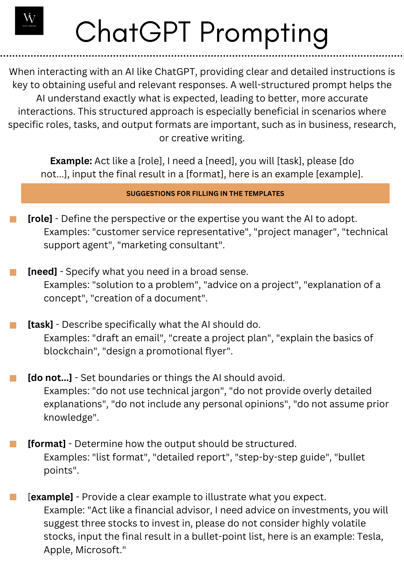 The effectiveness of AI largely depends on how well business owners and managers can communicate their needs and define tasks. This is where structured AI prompts come into play. A well-defined prompt ensures that AI understands the task at hand and delivers results that are precise and useful. Here’s an example template: